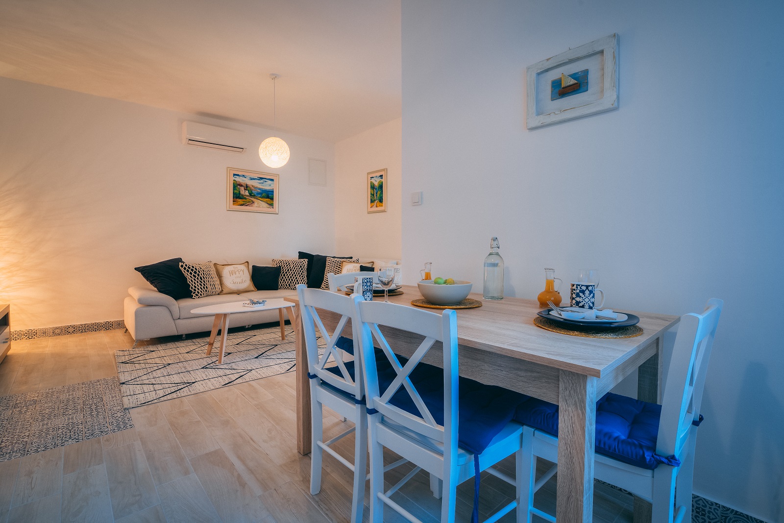Apartman je smješten na 2. katu tradicionalne kamene kuće sa veličanstvenom terasom s pogledom. Prostire se na 54 kvadratna metara uključujući spavaću sobu sa king-size krevetom dimenzija 2.00 x 1,80m, dnevni boravak sa sofom te kuhinjskim stolom za 4 osobe.